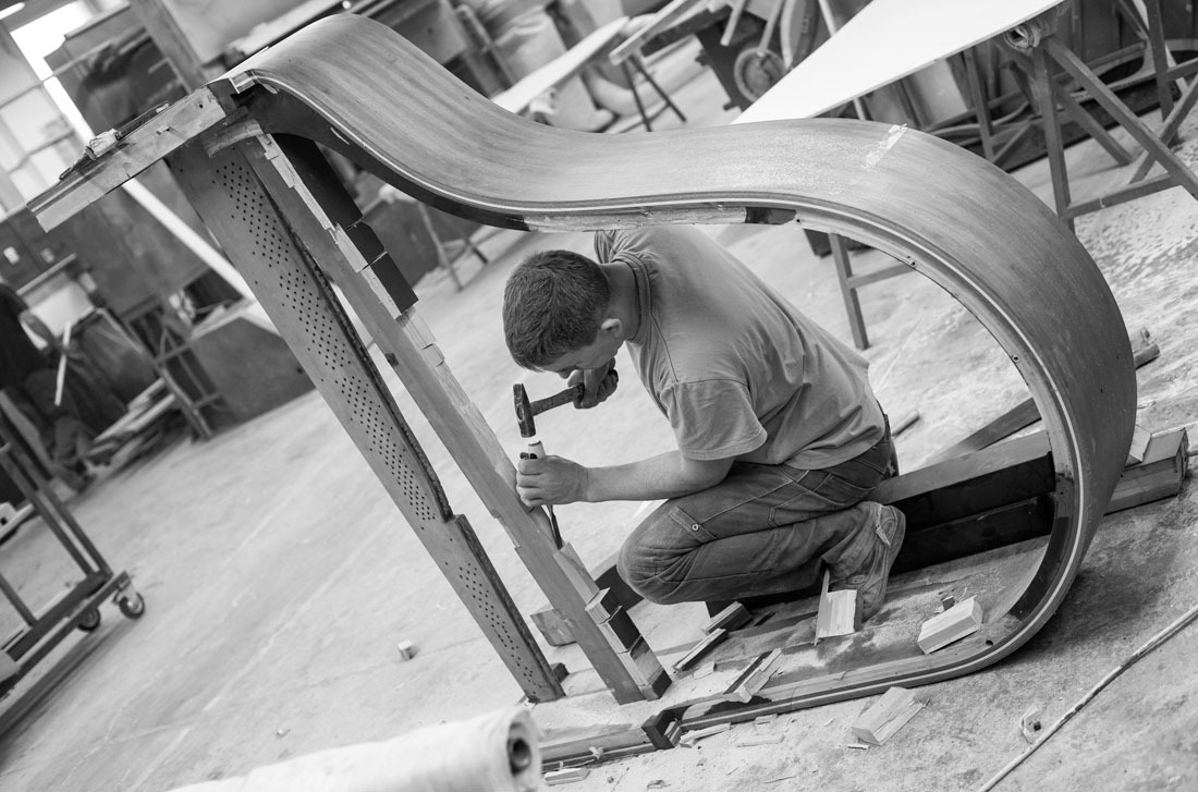 Anschließend wird die zuvor angefertigte Resonanzbodenplatte einer speziellen Bearbeitung in der Presse unterzogen, wodurch sie ihre endgültige Form erhält.