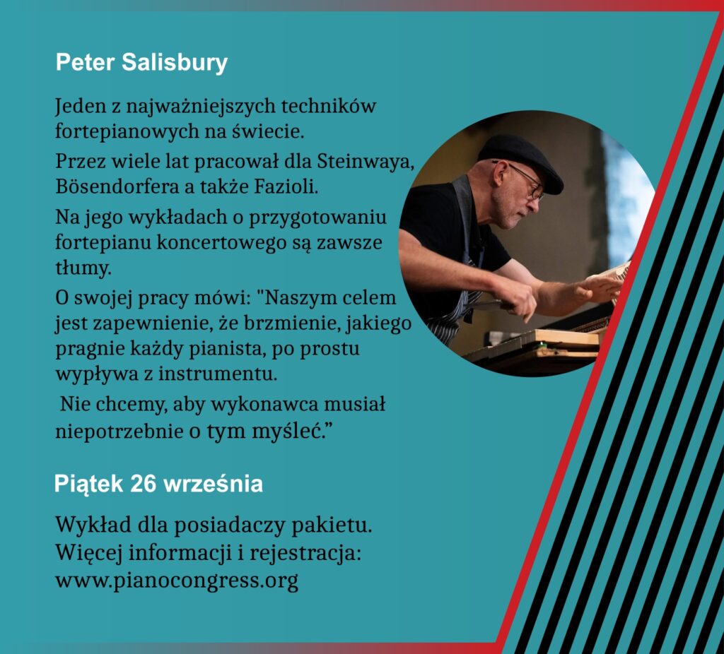 Wśród najbardziej wyczekiwanych warsztatów jest pokaz uznanego na świecie Petera Salisbury, technika koncertowego pracującego w branży fortepianowej od ponad 50 lat.